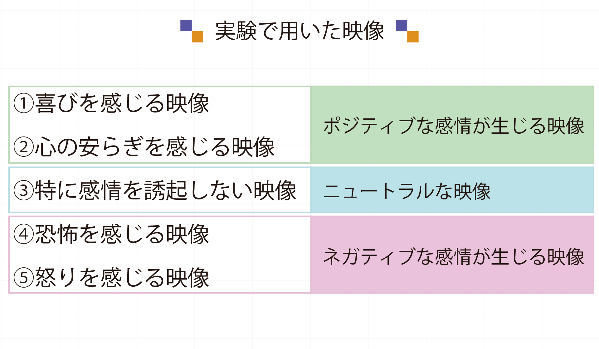 「拡張ー形成理論」を提唱したフレドリクソンは、ポジティブ感情が脳や心身に与える影響について映像を用いて調べました。実験では被験者を5つのグループに分け、それぞれ以下の動画を観るよう依頼しました。